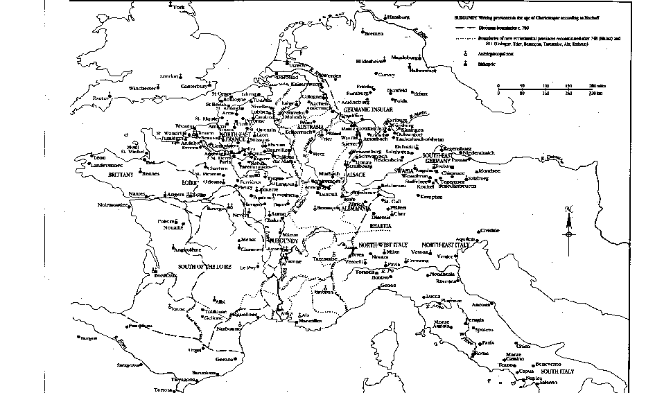 Adapted from a map in B. Bischoff, Manuscripts and Libraries in the Age of Charlemagne, translated by Michael Gorman (Cambridge: Cambridge University Press, 1994), a collection of Bischoff's most seminal and valuable essays on the subject on which he was an unrivalled master, this presents for orientation a conspectus of the writing centers of Carolingian Europe. There are higher-resolution subsets of the same map as well: